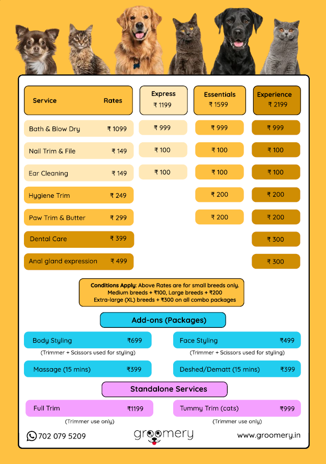 Indulge your furry friend in the ultimate grooming experience at Groomery. Our comprehensive range of services combines expert care with premium products to ensure your pet looks and feels their absolute best. From essential treatments to lavish spa packages, we offer tailored solutions for every breed and temperament. Discover our world-class grooming services and give your beloved companion the pampering they deserve.